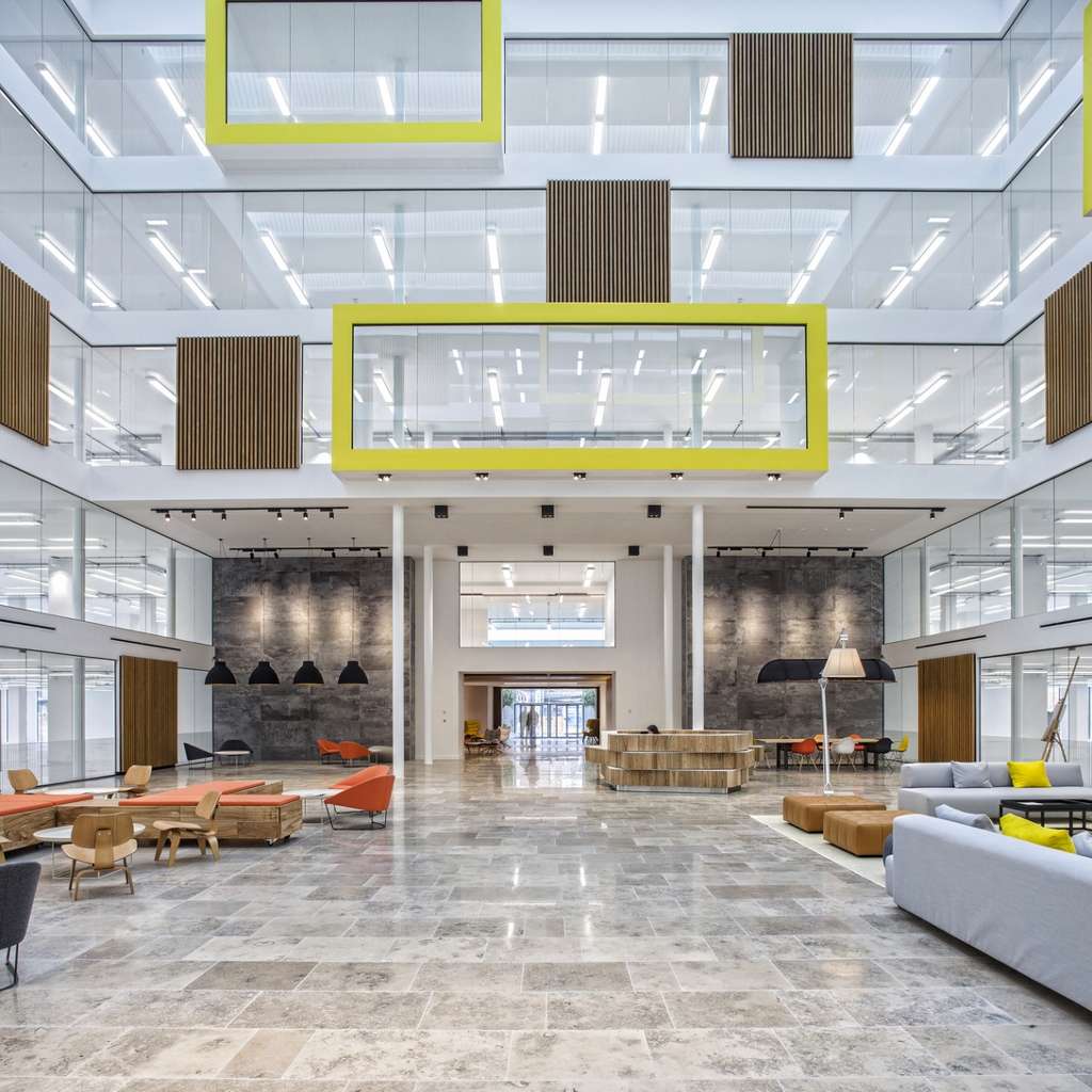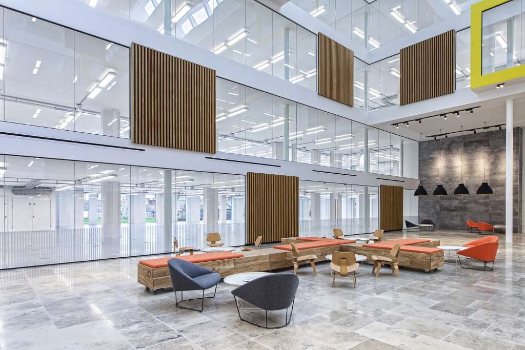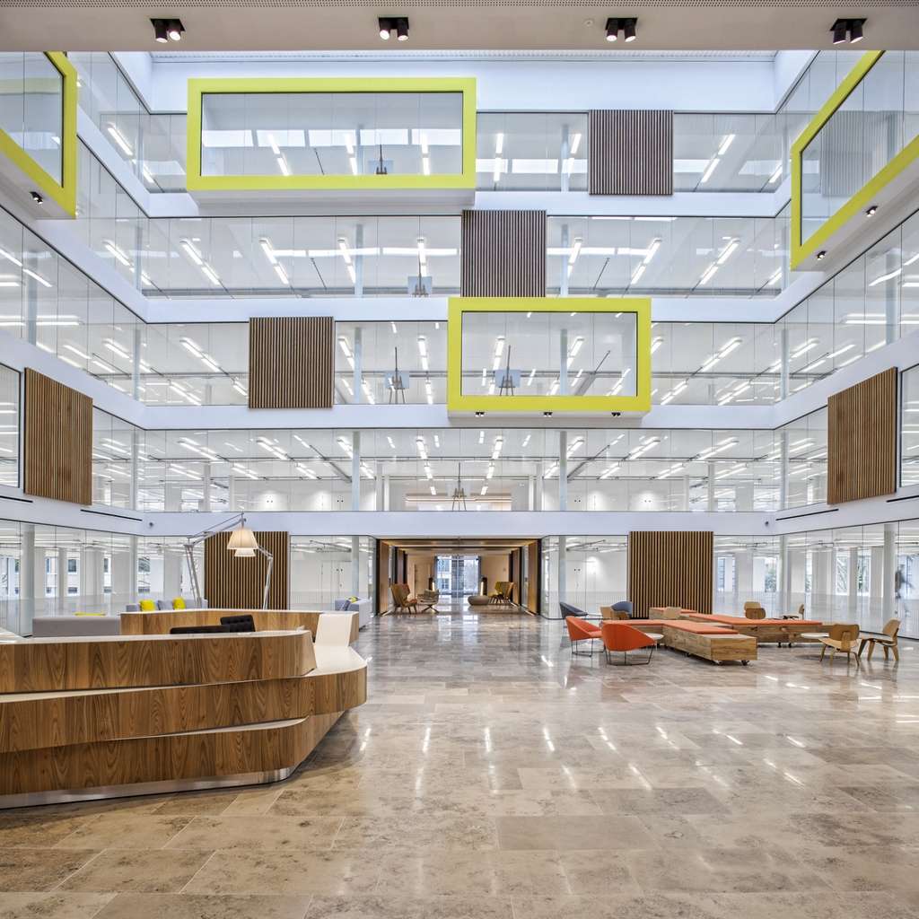The Southern and Northern entrances now connect through to the atrium creating the new Street, an area to be filled with cafes, restaurants and break out areas. The full height atrium creates a dramatic environment with glazing to all four sides and punched out office pods with feature acoustic timber paneling.