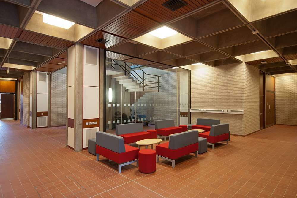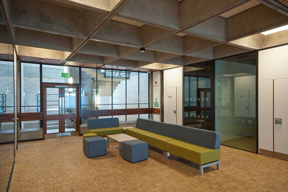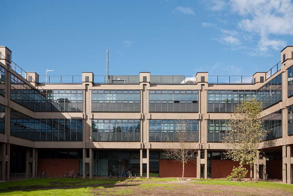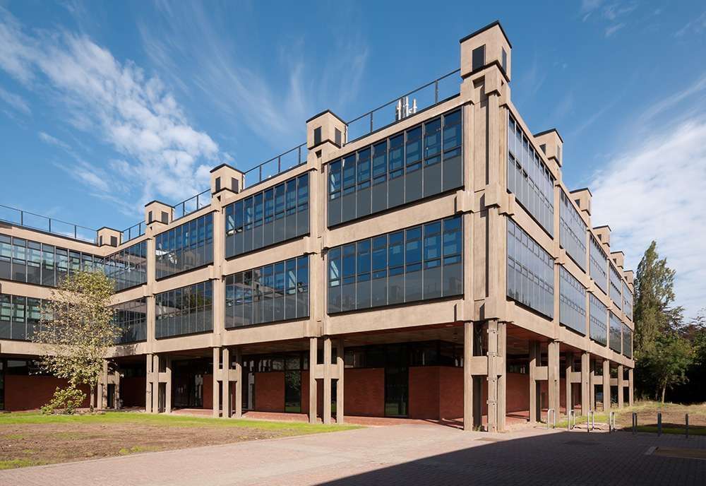 Designed by Philip Dowson of Arup Associates this grade 2 listed building consists of four similar three-storey blocks linked at each corner. The frame is pre-cast, reinforced concrete with columns in groups of four in a grid formation. This allows the services to be carried vertically and horizontally meaning that at no point are services more than ten feet away.